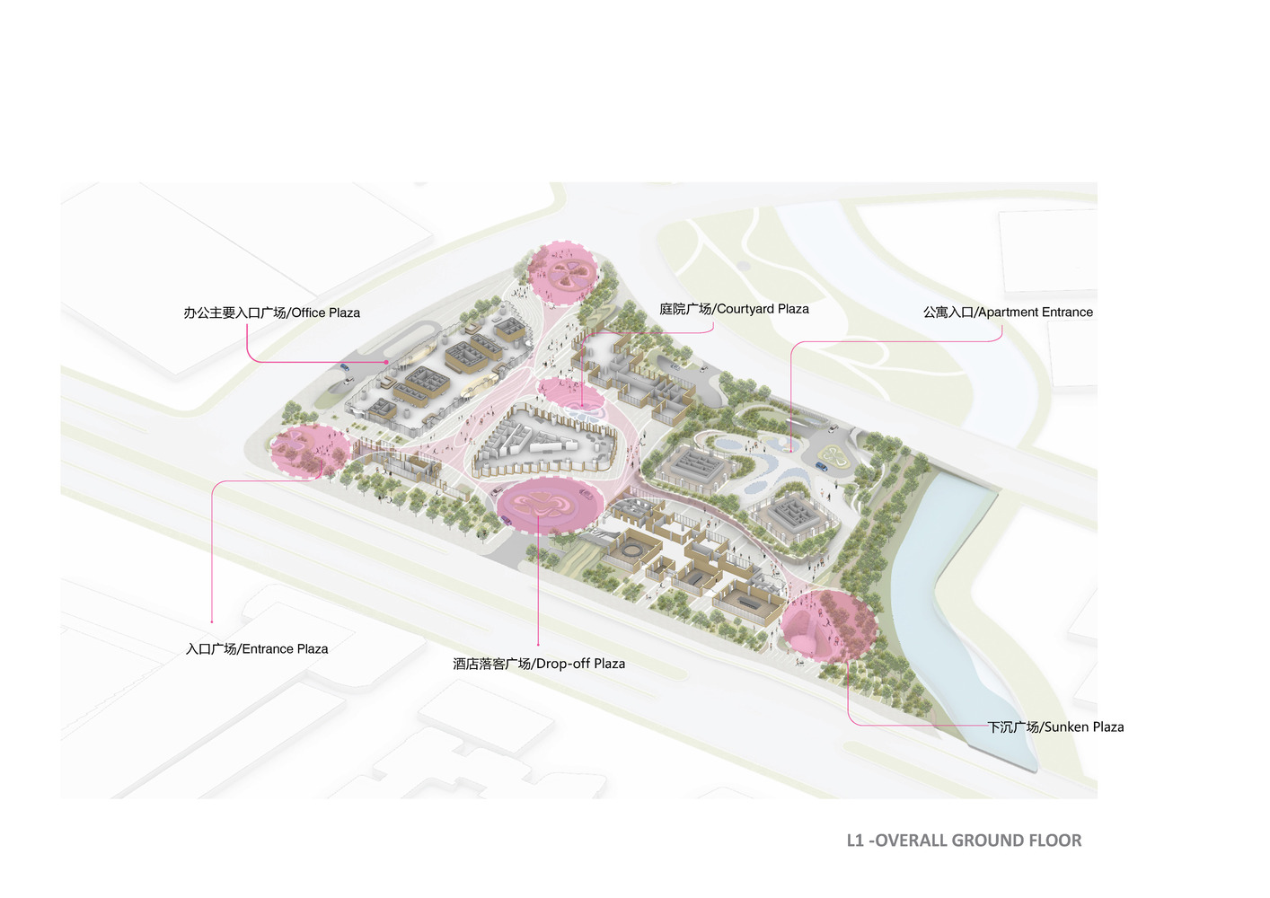 At ground level, the architectural volumes are adapted to better relate to the human scale, with horizontal variance introduced to also connect to the adjoining street. According to the architects, the design of the podiums and plazas of the lower levels takes cues from the ancient Liangzhu village in Hangzhou. The podium reinterprets the three-story buildings of the rural settlement, while the conference center, commercial units, a hotel ballroom, and art museum take the image of villa-like volumes sheltered by a large canopy. It results in a fluid network of plazas and pedestrian connections with semi-outdoor areas creating an enjoyable environment for residents to relax and interact.
