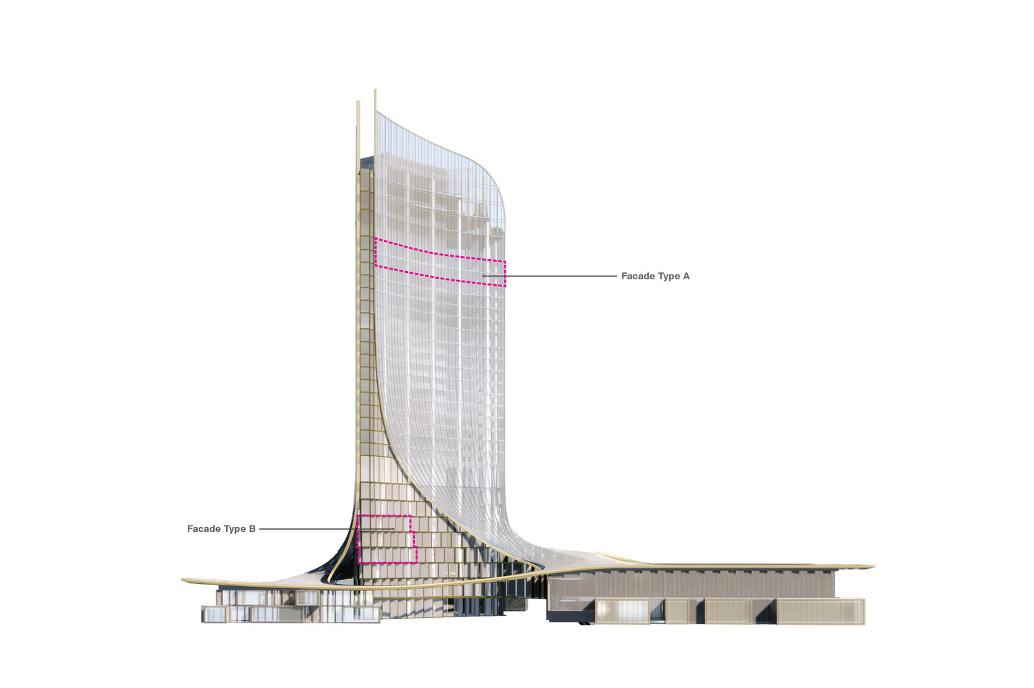 The facades of the central mixed-use tower open with glass canopies toward the central plaza, creating a gesture of openness and transparency. The wing-like canopies flow toward the lower areas to create a connection between the internal and external courtyards. The scaled glass of the canopies is designed to reflect sunlight and create a shimmering effect mimicking the waters of the Qiantang River. The resulting exterior spaces create an all-weather micro-environment, encouraging residents to interact and relax in the public spaces. The translucent canopy also maximizes daylight inside the building, while vertically placed fins prevent excessive heat penetration.