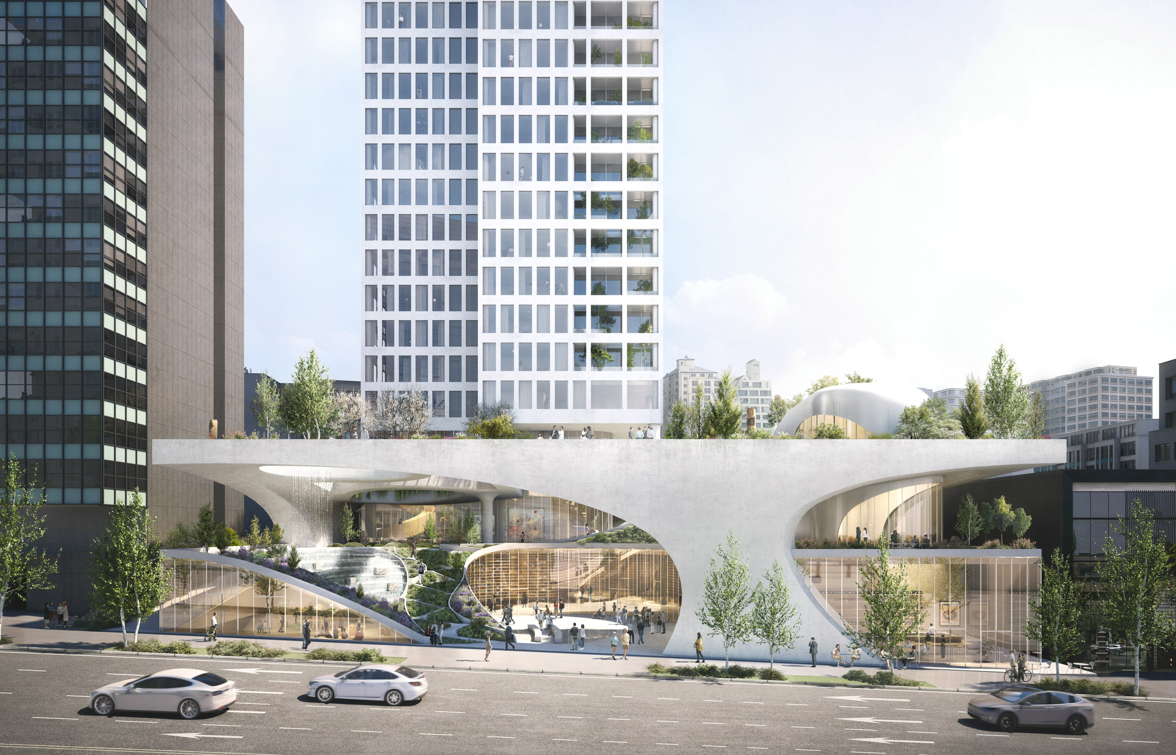 The podium's park, which is designed to be highly accessible with multiple entry points, will be landscaped with greenery, water features, sculptures and gallery space.