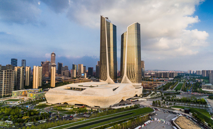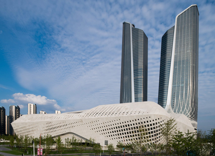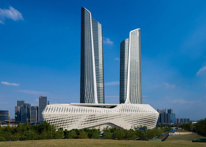 The Nanjing International Youth Cultural Centre located in China, occupies a site area of 5.2 hectares with a construction floor space of 465,000 square metres.