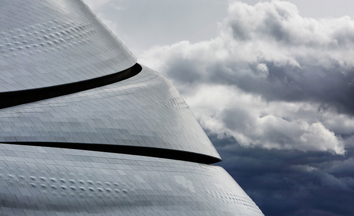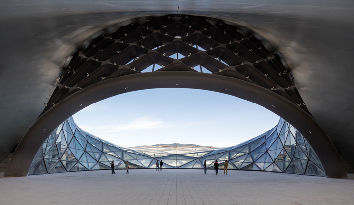 The Harbin Opera House has 80,000 m² total area under its shimmering, silvery metal skin, which evokes associations with snow cornices and icebergs. The complex, which is to be expanded to include a congress center and hotel, features opera halls for 1,600 and 400 spectators plus stages, associated spaces, and an underground parking lot. The exterior of the building was designed with 4 “dancing” ribbons and free-curved skylights.