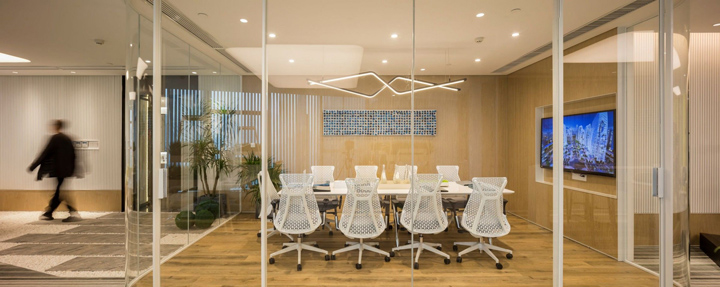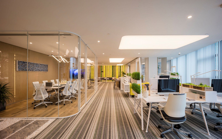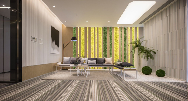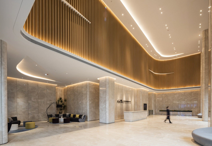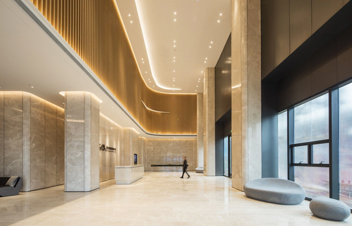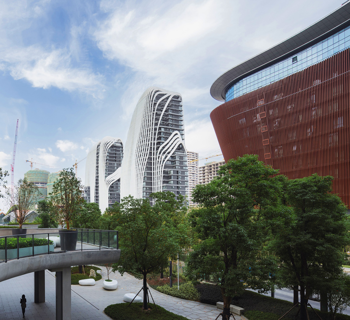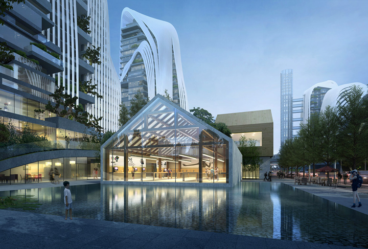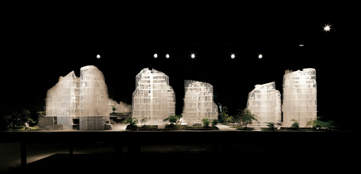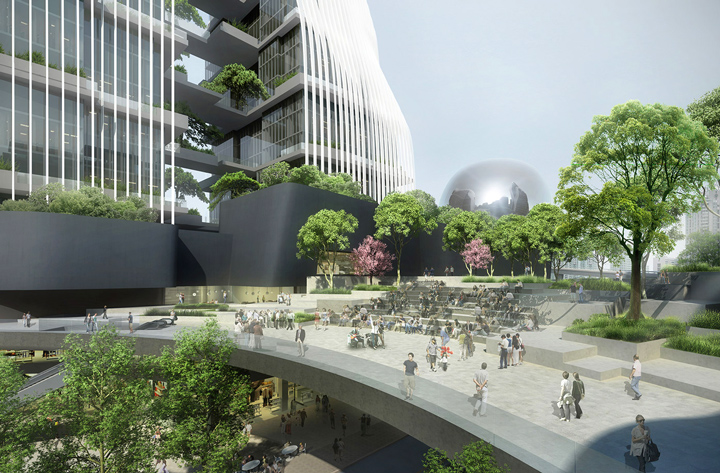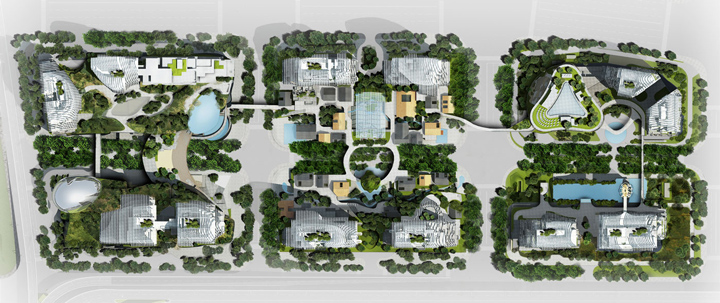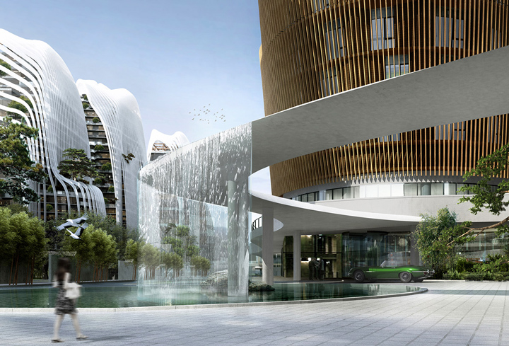 The mixed-use development has an overall building area of approximately 560,000 sqm, comprised of commercial, hotel, office, and residential programs. the high-rise structures (with a height of 120 m), located at the edge of the site, are characterized by vertical shading fins and permeable glass screens composed in a visually flowing form, reminiscent of waterfalls. This enclosure system creates interior spaces with plentiful light and ventilation, producing a subtle and calming environment. Additionally, ponds, waterfalls, brooks, and pools connect the buildings with the landscape both visually and functionally, serving to collect and recycle rainwater.